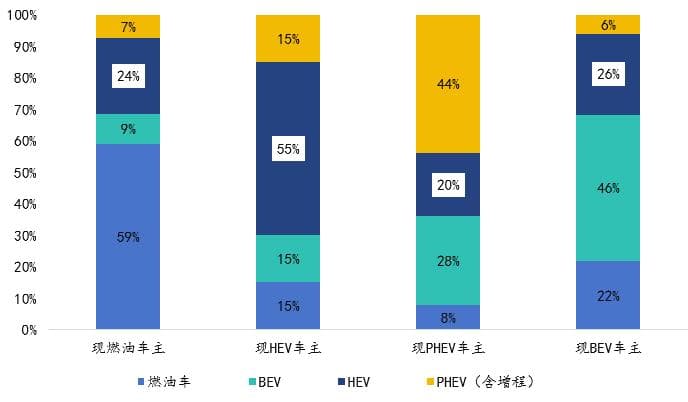 消费者对动力类型的选择存在较强的惯性依赖。对比现有车辆与未来购车意向的动力类型选择,约一半的用户仍会选择相同的动力类型。混合动力汽车使用体验与燃油车接近,是存量燃油车主向新能源转化的有效途径。24%的燃油车主再次购置时优先考虑HEV车型,同时HEV车主对新能源汽车的接受程度也更高(30%)。PHEV车主则更容易接受纯电,28%的PHEV用户下次购车时会优先考虑纯电车型。
