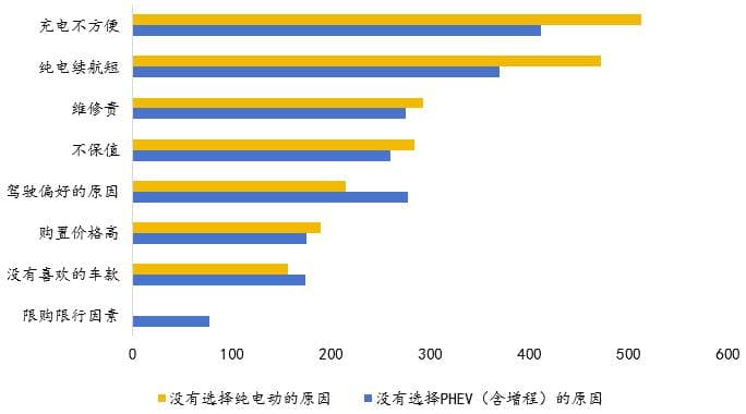 充电不方便、纯电续航短仍是造成消费者未选择新能源汽车的首要原因。在新能源汽车销量超预期增长的背景下,充电条件彻底改善仍需要时间。2022年,我国充电基础设施增量为259.3万个充电桩,而新能源汽车销量达688.7万辆,桩车增量比为1:2.7,长途充电难问题短期内很难得到根本改变。此外,维修费用与保值率也是消费者的顾虑因素。