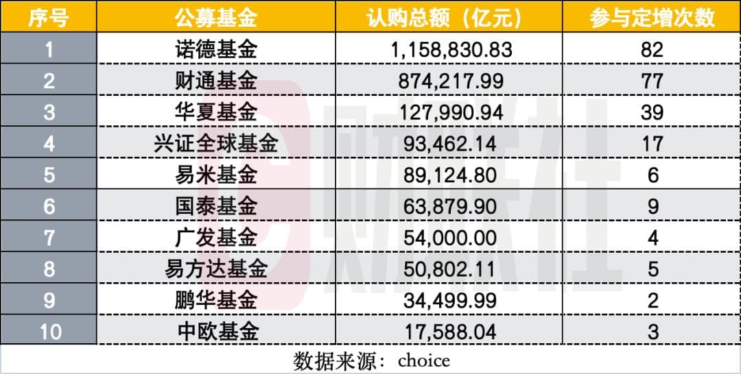今年以来,诺德基金、财通基金分别参与了82个、77个定增项目,认购总额分别为115.88亿元、87.42亿元。而去年同期,诺德基金、财通基金分别参与了183个、171个定增项目,认购总额分别为263.71亿元、233.69亿元。