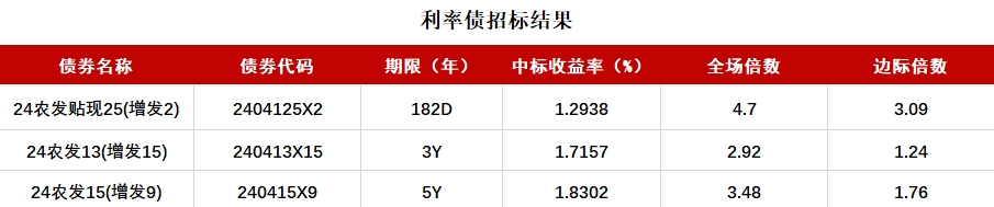银行间主要利率债收益率多数上行,截至下午16:30,10年期国债活跃券240011收益率上行1.4bp报2.1115%,30年期国债活跃券2400006收益率上行3bp报2.3175%,10年期国开活跃券240215收益率上行1.4bp报2.1715%。