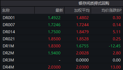 银银间回购定盘利率多数上涨。FDR001涨1.0个基点报1.48%;FDR007持平报1.75%;FDR014涨7.0个基点报1.87%。
