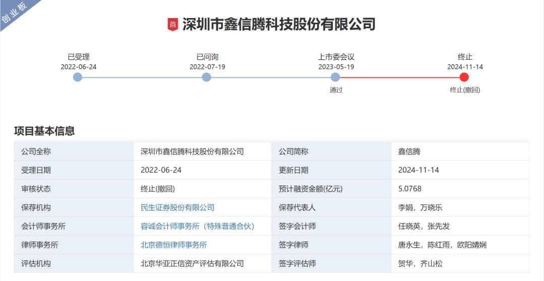 11月14日,深交所官网信息显示,深圳市鑫信腾科技股份有限公司(以下简称“鑫信腾”)创业板上市申请终止。