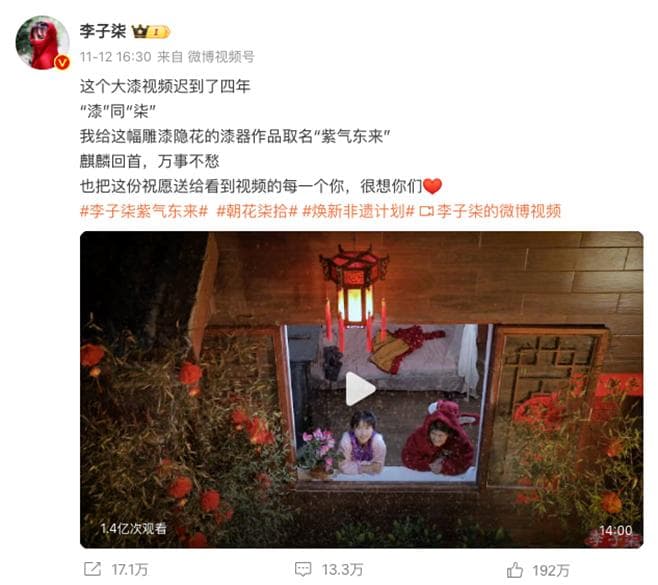 2024年11月12日,李子柒多平台同步更新两条视频,正式回归。随后,李子柒冲上各平台热搜榜第一。截止11月13日12时,李子柒两条视频累计播放量破5亿。