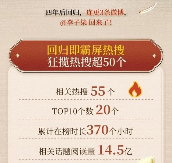 11月12日,李子柒更新两条视频,正式回归。24小时内,李子柒在微博平台喜提55个相关热搜,相关话题阅读量超14.5亿,累计在榜时长高达370个小时。飞瓜数据显示,近七天,李子柒抖音账号累计涨粉1199万、B站账号累计涨粉189.5万。