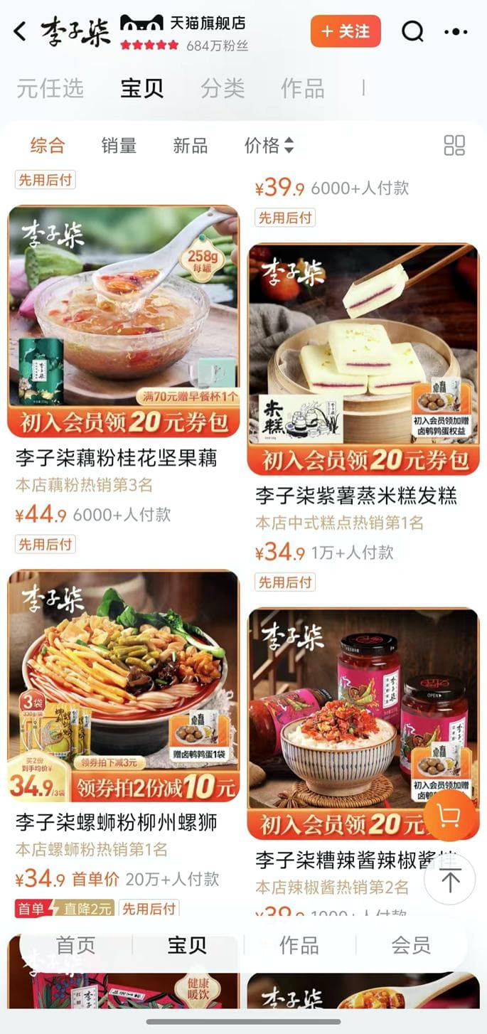 比如,李子柒天猫旗舰店正售卖李子柒牌的螺蛳粉、红糖姜茶、桂花坚果藕粉等商品。海豚智库披露的《2021最具成长性的中国新消费品牌》显示,2020年,李子柒品牌年销售额为16亿元,同比增长300%,排名第32位。
