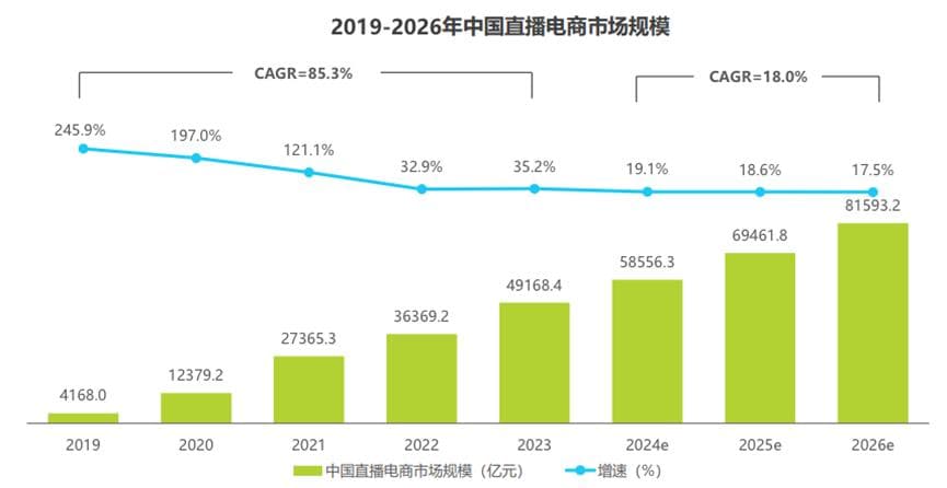 李子柒消失的这几年,经过市场大浪淘沙,网红产业探索出的最有效的商业化变现手段,当属直播带货。艾瑞咨询披露的数据显示,2023年,中国直播电商市场规模为4.91万亿元,2020以来的复合年增长率为58.31%。“挖呀挖”黄老师、东北雨姐等网红成名后,均第一时间开展直播带货,以打通商业闭环。