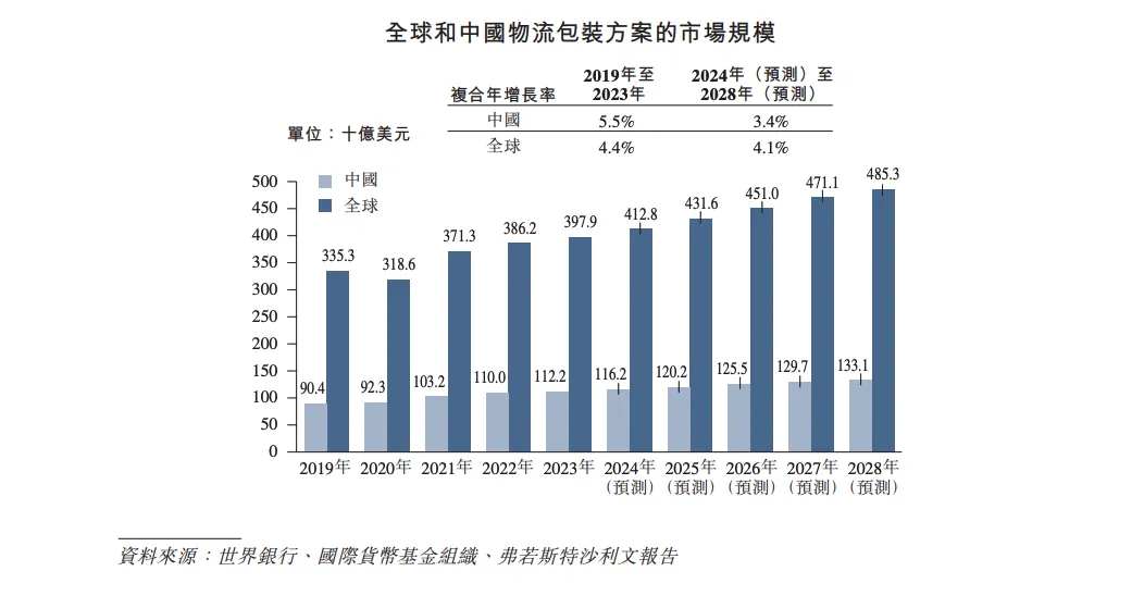 行业层面,据弗若斯特沙利文的资料,按收入计,全球物流包装方案由2019年的3353亿美元增至2023年的3979亿美元,复合年增长率为4.4%,预期于2028年将达到4853亿美元,2024年至2028年的复合年增长率为4.1%。