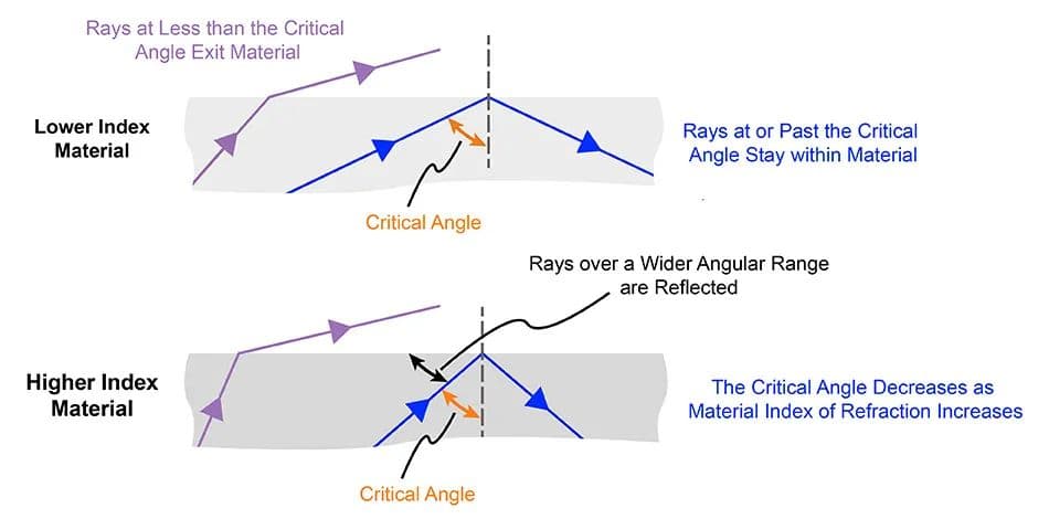 光线无法射出材料的角度称为“临界角”,材料的折射率越高,光线无法射出的“临界角”就越小。