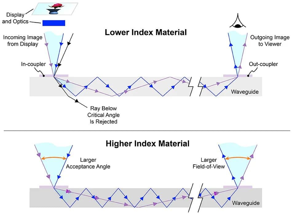 如果使用的波导衬底材料的折射率更高,它的临界角就更小,出射光线的视场就越宽。波导衬底材料的光学折射率对于FoV意义重大:FoV越大,眼镜的沉浸感越强,用户体验立马拉开档次。