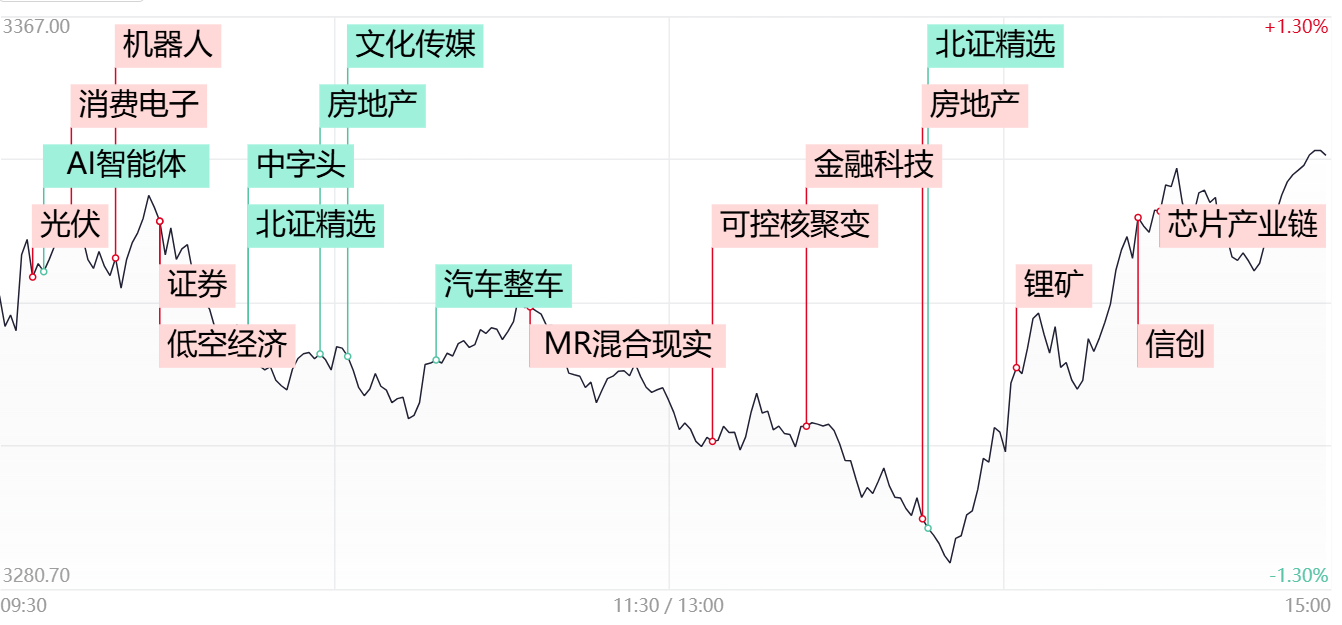 财联社11月19日讯,市场午后V型反弹,创业板指领涨,沪指3300点失而复得,全市场超4500只个股上涨。沪深两市全天成交额1.56万亿,较上个交易日缩量1996亿。盘面上,锂矿股午后爆发,天齐锂业、融捷股份、赣锋锂业、中矿资源等涨停。机器人概念股集体走强,爱仕达、柯力传感、拓斯达、东方精工等涨停。芯片股震荡反弹,国芯科技、慧智微、康强电子、盈方微涨停。互联网金融概念股表现活跃,汇金科技、生意宝涨停。可控核聚变概念股盘中异动,久盛电气、弘讯科技、融发核电等涨停。板块方面,锂矿、人形机器人、可控核聚变石墨电极、银行、钢铁、房地产等板块涨幅居前,ST、煤炭等少数板块下跌。截至收盘,沪指涨0.67%,深成指涨1.9%,创业板指涨3%。
