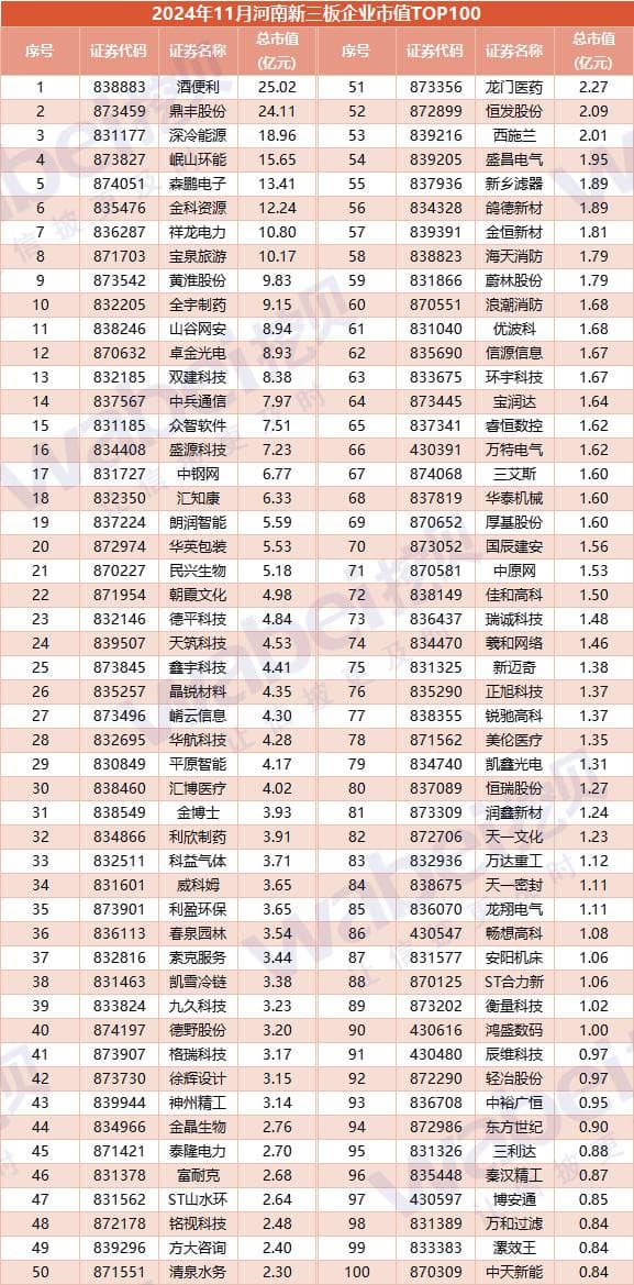 附-2024年11月河南新三板企业市值TOP100(数据截至11月14日收盘)