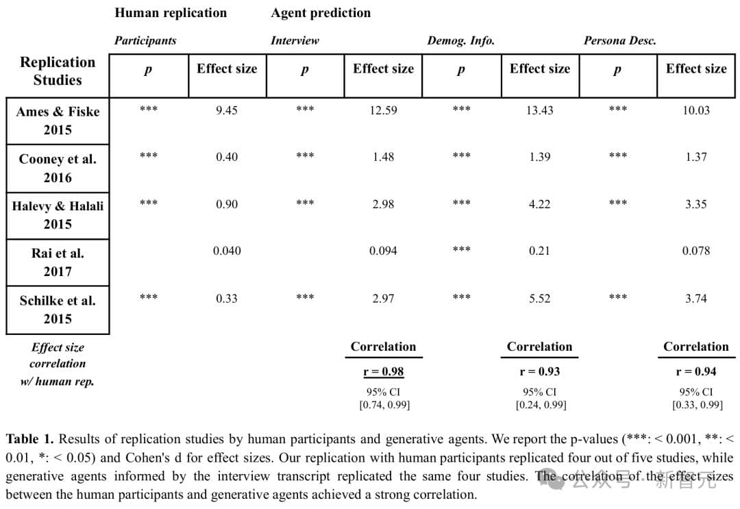 如下表所示,人类成功复现了5项研究中的4项,其中1项失败。而生成式智能体也复现了相同的四项研究,同样未能复现第五项。