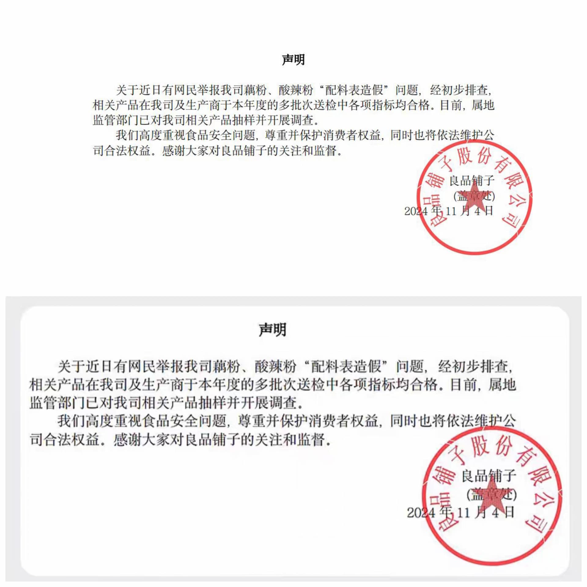 11月18日晚,随着市场管理局官方通报的发布,良品铺子迅速发布公告表示,经初步排查,相关产品在公司及生产商于本年度的多批次送检中,各项指标均合格。本次事项相关产品 2024年1至9月收入占公司收入的比例很小。公司历来高度重视食品安全问题,尊重并保护消费者权益,同时也将依法维护公司合法权益。