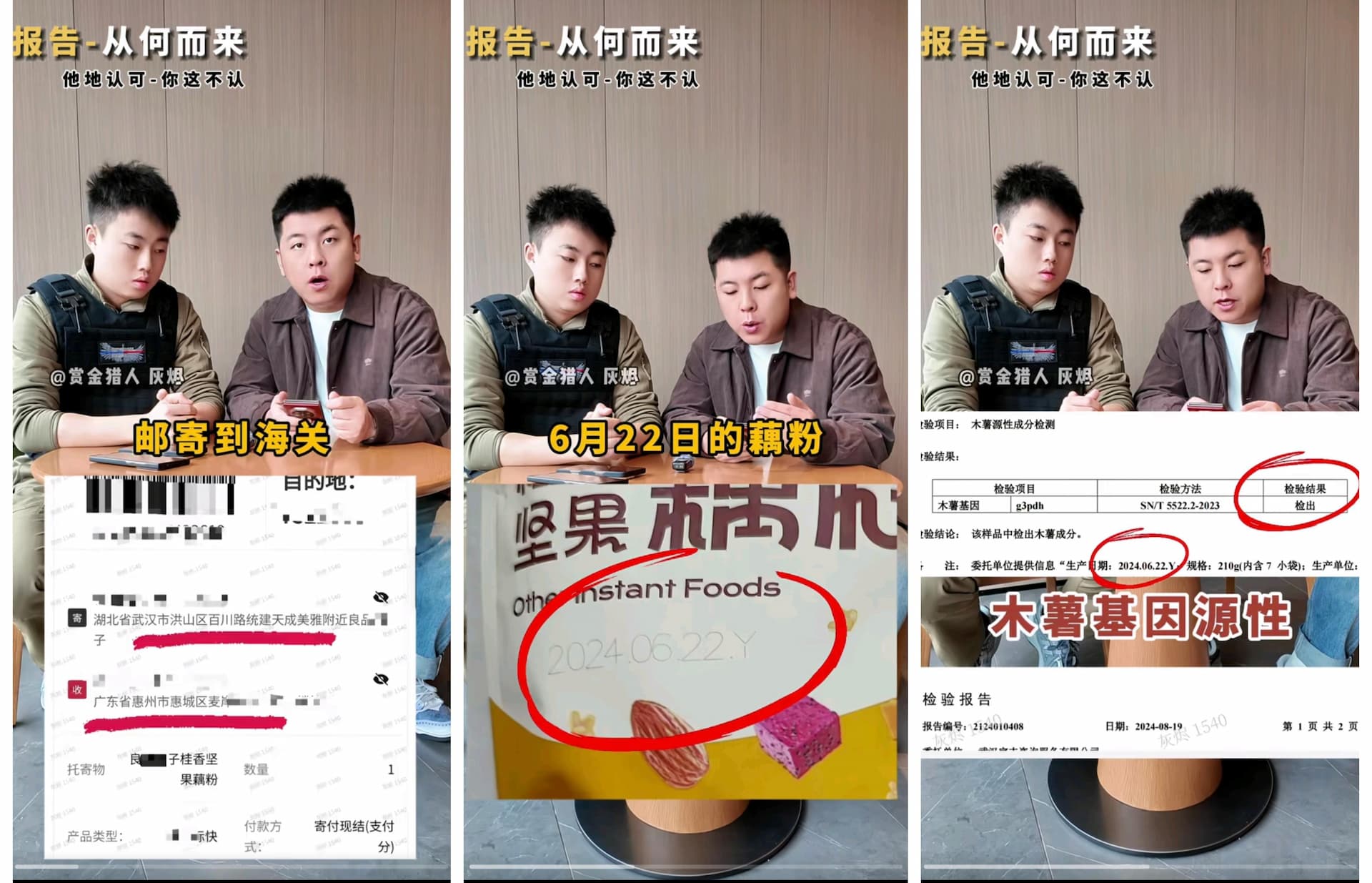 11月19日下午,两人再次发布视频详细复盘了是如何远程购买样品送检、6月产品批次中藕粉产品又是如何确认检测出木薯的情况。据“松哥打虎”透露,通过该方法,其已成功完成了对农村生活博主“东北雨姐”带货产品、知名藕粉品牌“周氏”产品的掺假举报。