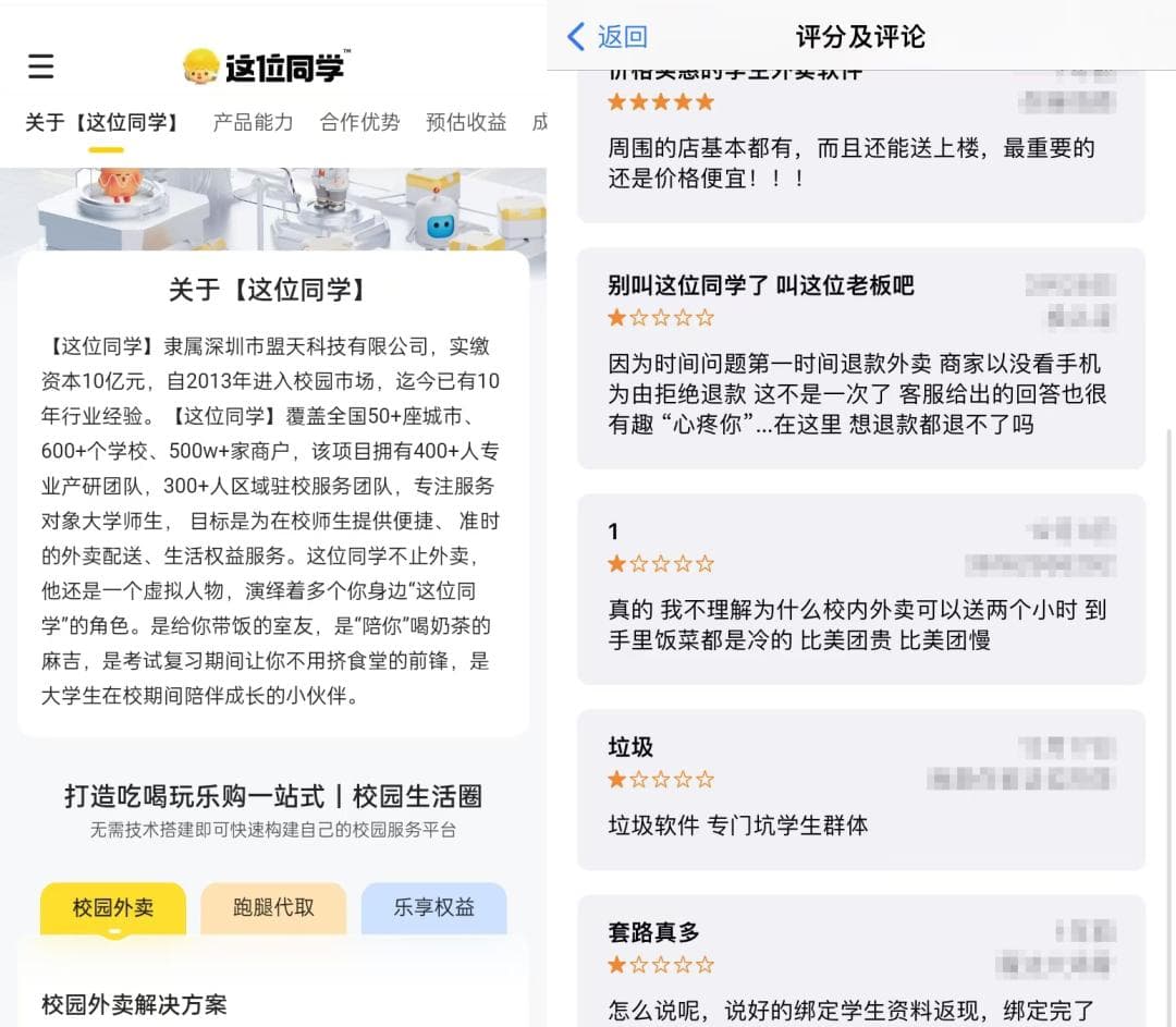 不过,源媒汇并未发现盟天科技发布过什么游戏。登录盟天科技官网,能看到一个名为“这位同学”的校园外卖平台。平台介绍,“这位同学”隶属于盟天科技,实缴资本10亿元,2013年就进入校园市场,目前已覆盖全国50多个城市、600多家学校、500多家商户,业务涉及校园外卖、跑腿代取、乐享权益。