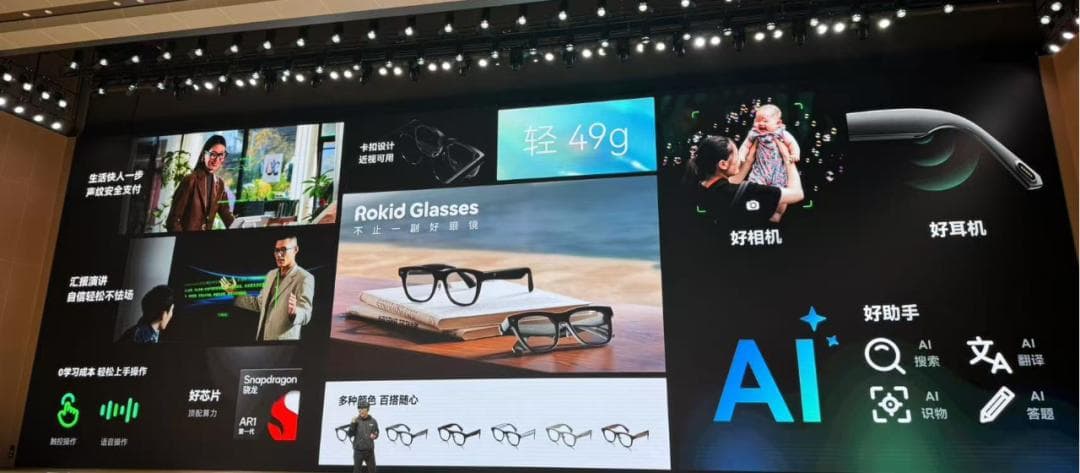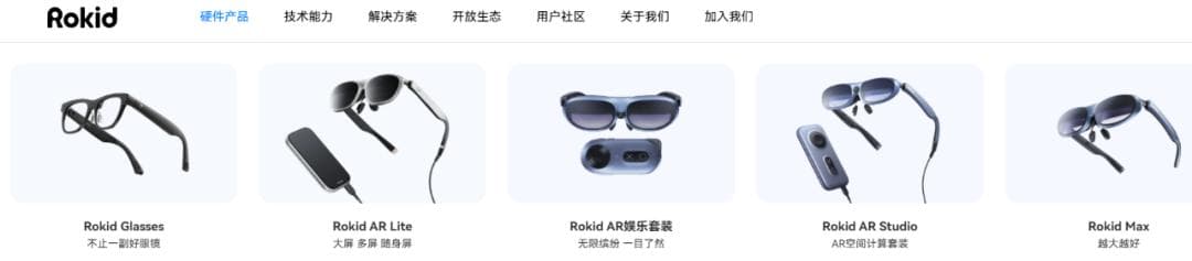 创业十年,Rokid发布了多款产品,有消费级AR智能眼镜Rokid Air、Rokid Max、Rokid AR空间计算套装、Rokid AR娱乐套装、Rokid AR Lite。从产品名字上,此次最新发布的Rokid Glasses是第一个在宣传中未单独提及AR的眼镜,而是变为了AI+AR眼镜。