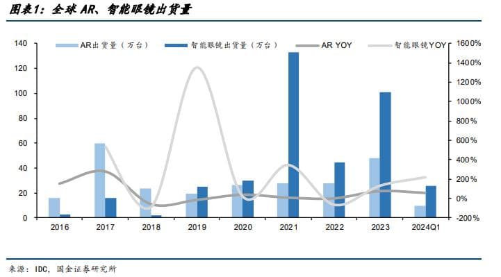 IDC数据显示,2023年全球AR眼镜销量为48万台,智能眼镜销量为101万台。2024年一季度全球AR眼镜出货量为10万台,同比增长56%;智能眼镜出货量为26万台,同比增长217%。