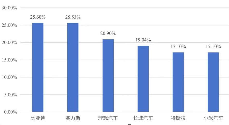 2024年三季度,比亚迪、赛力斯、理想汽车、长城汽车、特斯拉、小米汽车毛利率。制图/宋立伟