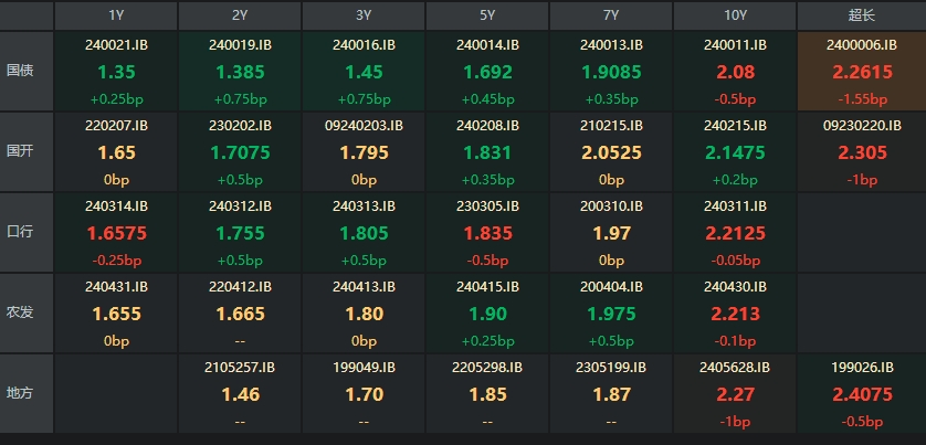 银行间主要利率债收益率涨跌不一,截至下午16:30,10年期国债活跃券240011收益率下行0.5bp报2.08%,30年期国债活跃券2400006收益率下行1.55bp报2.2615%,10年期国开活跃券240215收益率上行0.2bp报2.1475%。