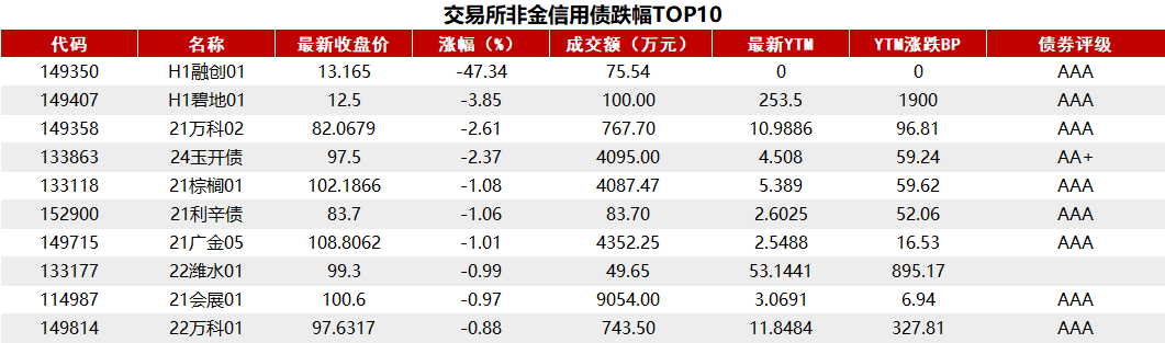据Choice 数据统计显示,今日交易所市场非金信用债跌幅排行前五的分别是:H1融创01、H1碧地01、21万科02、24玉开债、21棕榈01。具体如下: