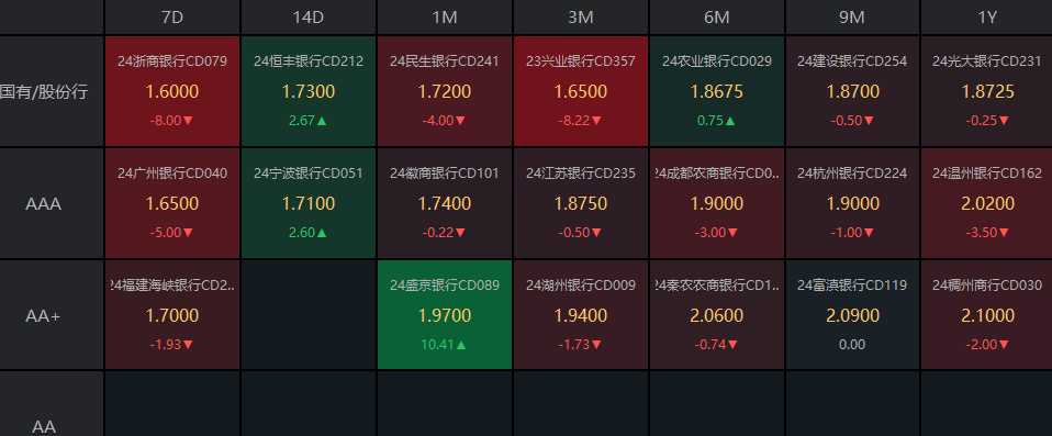 存单方面,今日3M期国股在1.64%-1.85%位置需求较好,较前一日下行8bp,1Y期国股报在1.86%-1.94%的位置,较前一日下行0.25bp。AAA级存单方面,9M成交在1.9%,1Y成交在2.02%的位置。