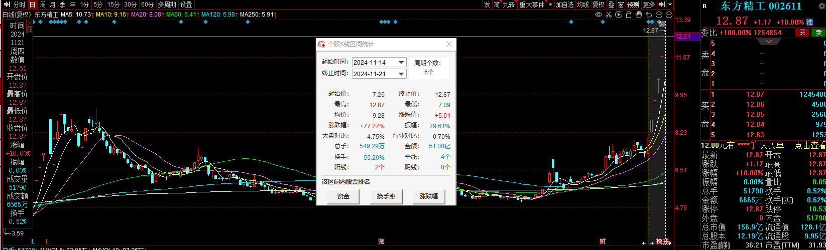 从二级市场表现来看,东方精工最近6个交易日股价连续涨停,截至今日收盘,该股股价涨停报收12.87元/股,且仍有超124万手封单封住涨停。该股在11月14日至11月21日期间的6个交易日累计涨幅达77.27%。