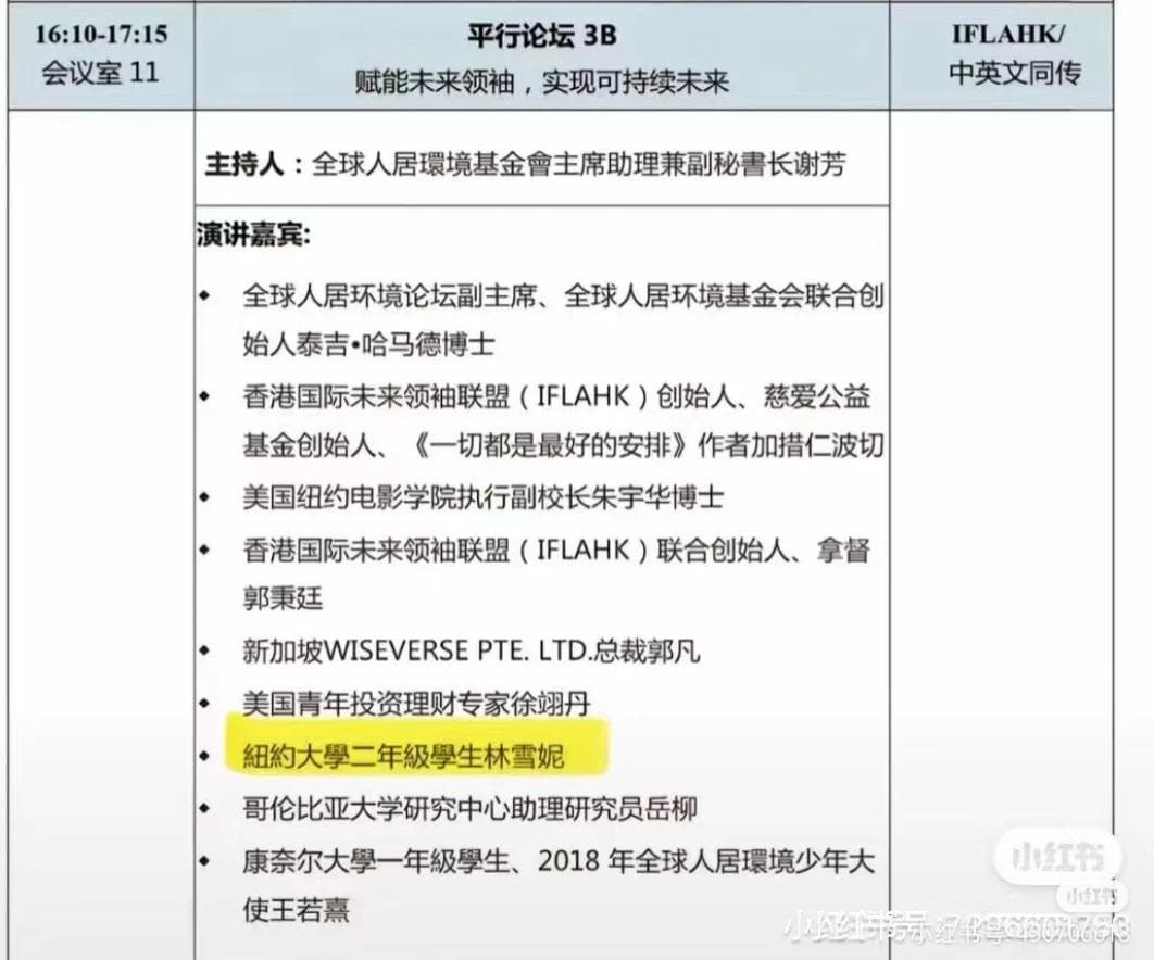 正如在纽约大学读书的“超级富婆”Shirley林,活动主题叫做《赋能未来领袖,实现可持续未来》,像极了你领导喜欢平常喜欢写的八股文,从主题到参会嘉宾处处透露着“身在外也不忘祖国”,看着会议各位嘉宾的名字,你就知道大抵都和国人有着千丝万缕的关系。