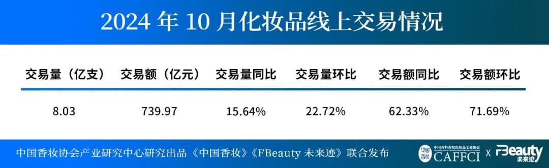 10月化妆品线上交易额为739.97亿元,同比增长62.33%,环比增长71.69%。创下今年单月最大增幅。