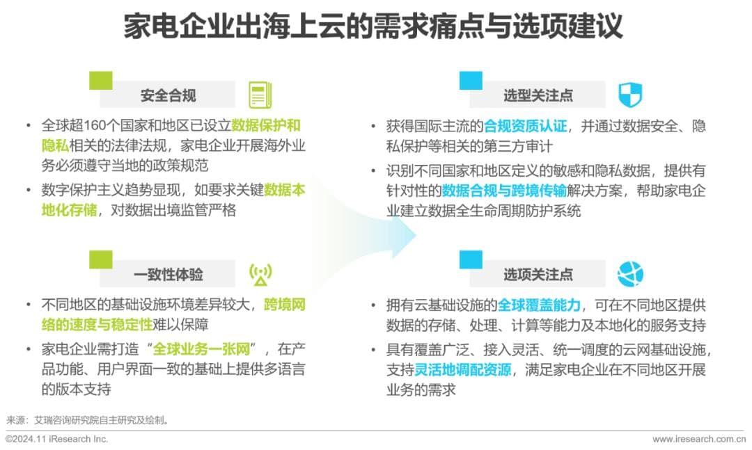 海外云厂商相比国内云厂商在全球拥有更广泛的节点分布,同时考虑到数字保护主义抬头,选择海外云厂商也可以在一定程度上规避地缘政治的潜在风险。除此之外,海外云厂商更早地开展全球化布局,在全球各区域能够提供更加全面、精细化的云产品以及本地化的服务团队支持,从而为家电企业出海保驾护航。