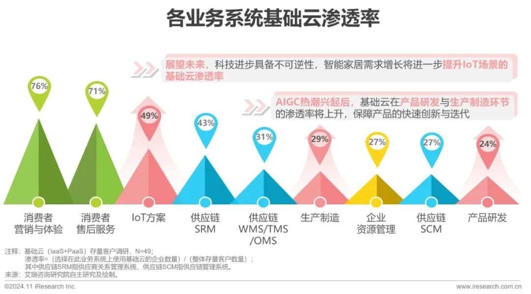 围绕消费端的业务系统渗透率较高,IoT、研发与制造系统渗透率将上升