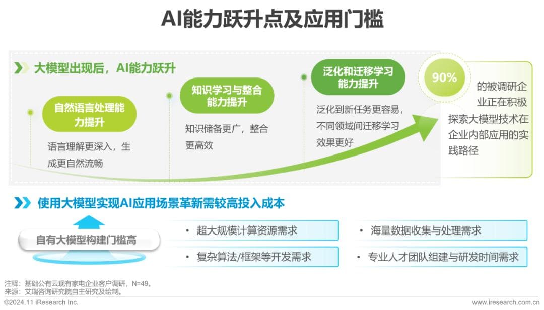 2022年OpenAI对GPT3.5模型进行了监督训练、强化学习等调整,面向公众发布对话式模型ChatGPT,其不知疲倦的创造力迅速引燃市场。AI能力跃升后带来的热潮验证了此类生成式模型及其底层技术普及的可行性,厂商竞相入场。调研中有90%的家电企业表示正在积极探索大模型在企业内部应用的实践路径,但其构建门槛较高,企业更需要集中精力探索AI能力与场景的结合,而非花费大量资源构建底层模型。