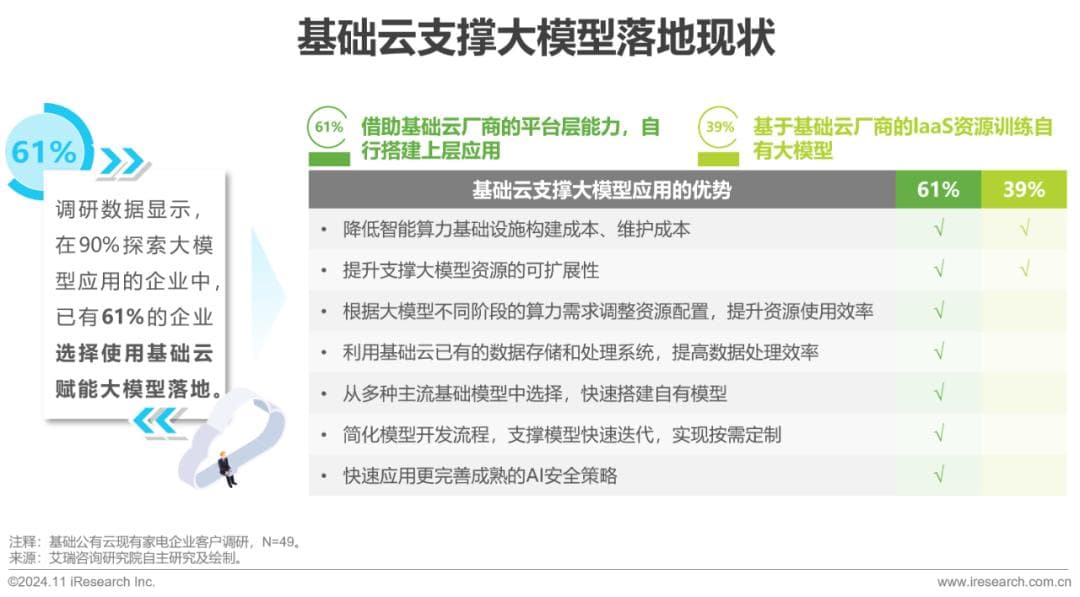 已有61%的企业借助基础云支撑大模型应用。其中,61%的家电企业选择基础云厂商提供的MaaS能力搭建大模型能力及应用。与选择仅借助IaaS资源的家电企业相比,这种选择能更高效地利用云厂商的先进技术和大模型生态资源,降低研发成本,缩短产品上市时间。此外,这种模式还有助于企业专注于核心业务逻辑,以更加灵活地应对技术变革与需求更替,实现AI业务的持续增长和创新。