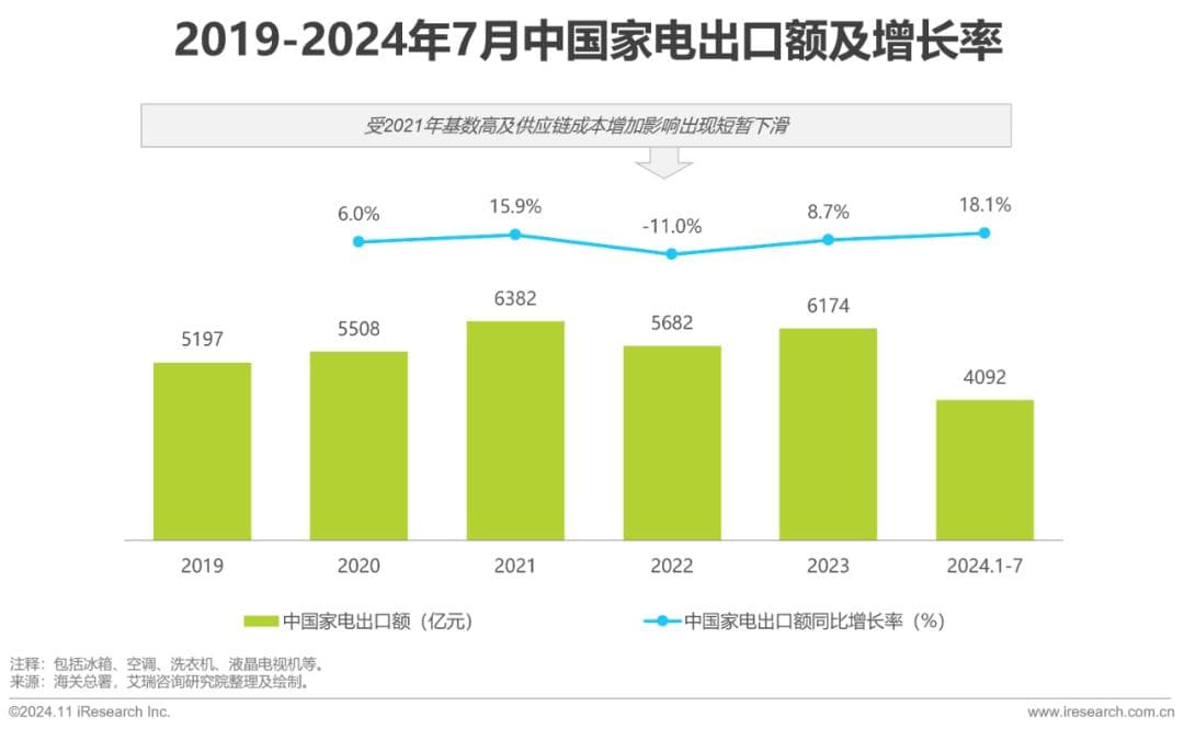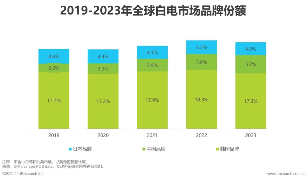 面对中国家电市场的饱和态势,众多家电企业将目光投向海外。根据海关总署数据,2024年1月-7月,包括电扇、洗衣机、吸尘器、微波炉、液晶电视在内的家电累计出口4091.9亿元,同比增长18.1%。与早期的ODM模式不同,这一阶段的家电企业出海更倾向于在新兴市场开店设厂,并且开始逐渐从单纯的产品出海向高附加值的品牌出海转变。以白电为例,中国家电品牌持续压缩日韩等其他国家品牌的市场空间,在海外市场的份额已经由2019年的2.6%增加到2023年的5.7%,国际影响力进一步提升。
