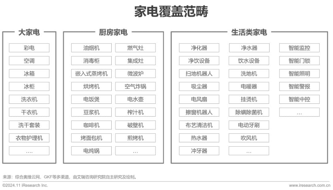 本次调研的家电企业为自有品牌的家电生产企业,不包括上游的零部件和原材料供应商或代工厂。调研的家电品类覆盖所有家庭中使用的电器设备,包括彩电、空调、冰箱等大家电,也包括厨房大小家电和生活类电器,智能家居的智能黑白电、监控、门锁、照明、中控等也均包含在内。