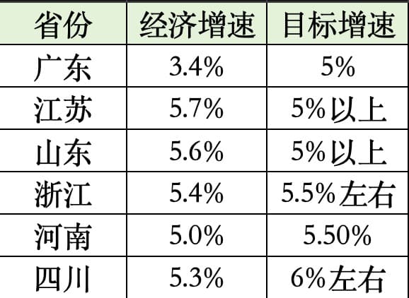 不仅江苏,6个经济大省年初设立的目标都在5%左右或以上,其中四川目标最高,为6%左右,浙江、河南的目标是5.5%左右。