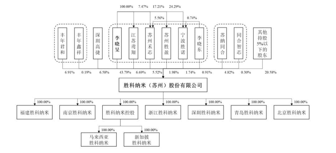 招股书显示,IPO前,李晓旻直接持有胜科纳米43.79%的股份(IPO后为39.41%),并通过江苏鸢翔控股6.69%、通过苏州禾芯控股5.52%、通过苏州胜盈控股1.98%、通过宁波胜诺控股1.74%,其通过直接和间接方式合计控制公司59.72%的股份(IPO后约为53.76%)。