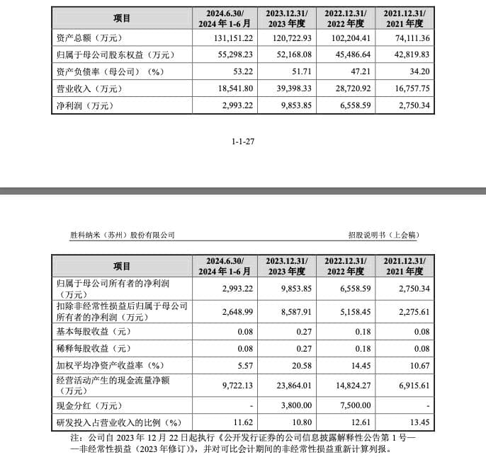 2021-2023年及2024年上半年(下称:报告期),胜科纳米的营业收入分别约1.68亿、2.87亿、3.94亿、1.85亿元;净利润分别约为2750.34万、6558.59万、9853.85万、2993.22万元;扣非归母净利润则为2275.61万、5158.45万、8587.91万、2648.99万元。