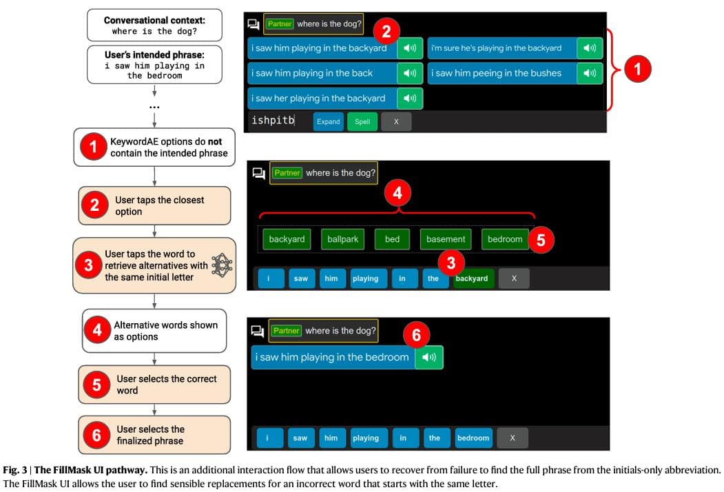 KeywordAE 和 FillMask 是两种替代交互模式,用于从通过仅首字母路径无法获得预期短语中恢复。在当前研究中,SpeakFaster UI 允许用户在使用 KeywordAE 模式后使用 FillMask 模式,这对于在难以预测的短语中找到正确的单词很有用。