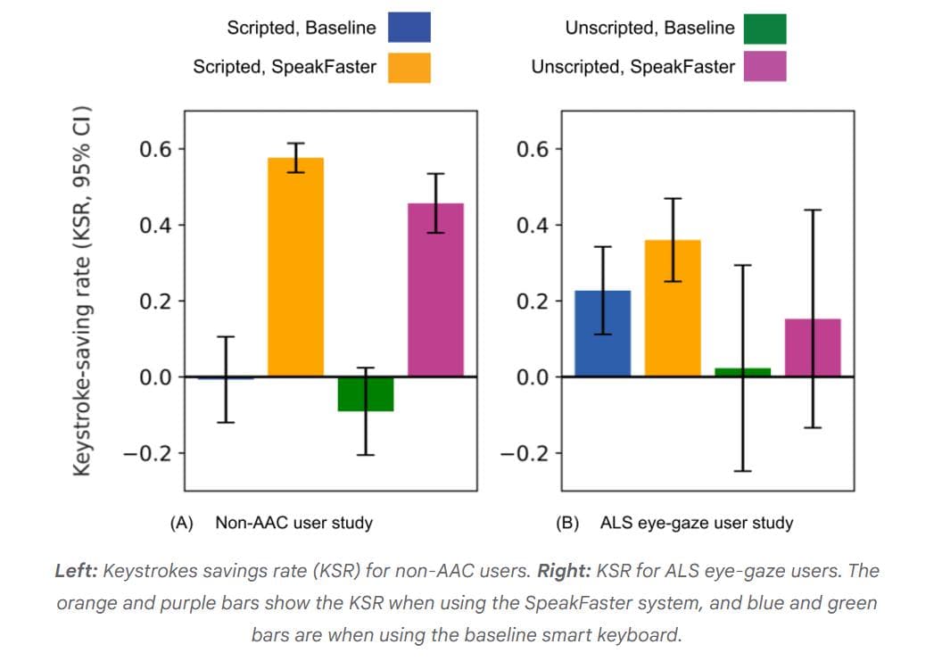图|左图:非 AAC 用户的KSR。右图:ALS 眼动用户的 KSR。橙色和紫色条显示使用 SpeakFaster 系统时的 KSR,蓝色和绿色条显示使用 baseline 智能键盘时的 KSR。