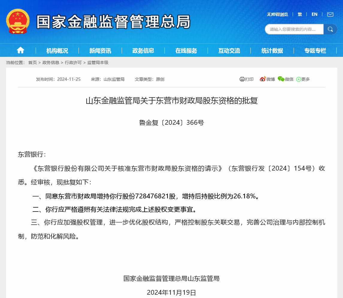 11月25日,国家金融监管总局官网披露,同意东营市财政局增持东营银行股份728476821股,增持后持股比例为26.18%。今日,记者查询监管部门网站发现,这是年内第二起地方财政局直接下场而非绕道地方金控集团增持中小银行的案例。
