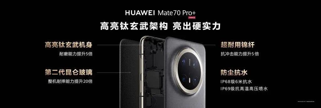 华为 Mate 70 Pro 与 Pro+ 使用高亮钛玄武机身,耐磨能力提升 5 倍,后背的超耐用锦纤抗冲击能力比普通玻璃提升 5 倍,第二代昆仑玻璃整机耐摔能力提升 20 倍,全机身支持 IP68 级 6 米抗水以及 IP69 级抗高温高压喷水,使用中的意外再也不会让人心惊胆战。