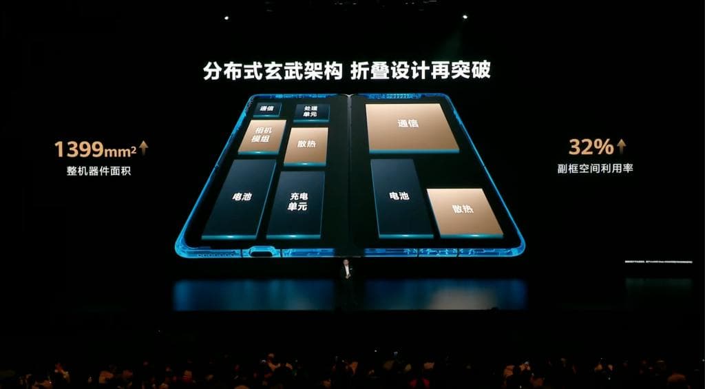 Mate X6 采用了全新的分布式玄武架构,提升了整机内部器件的面积,不仅通信模块更巨大,信号更好,也带来了更强的分布式散热能力,加上全新的石墨烯导热材料,设备的性能进一步提升。