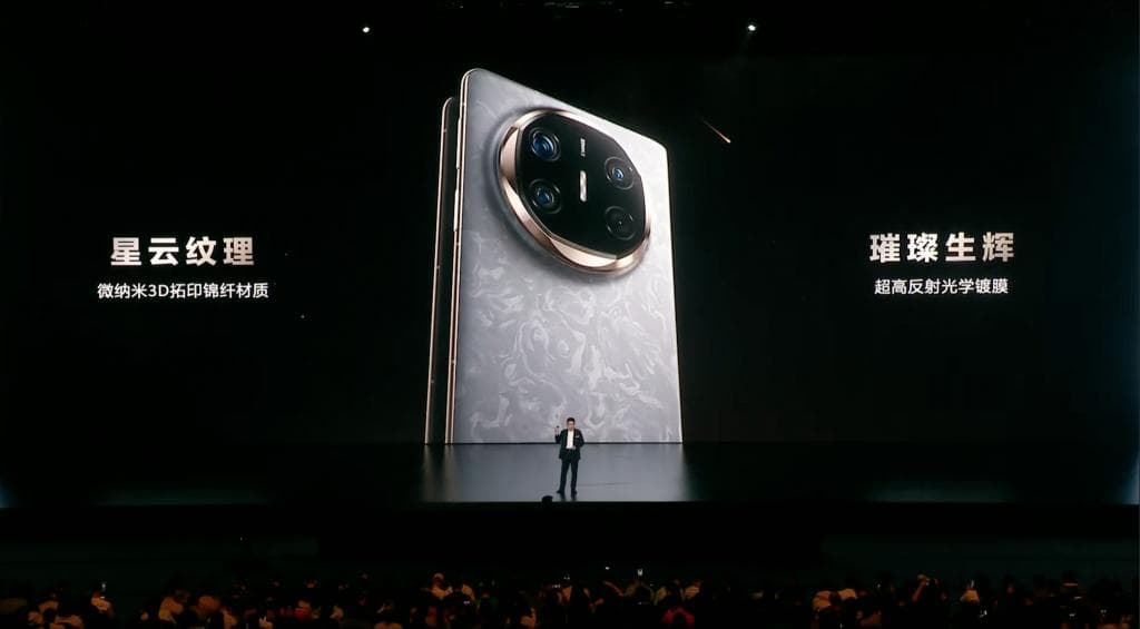 设计上,Mate X6 有两种不同材质,其中一种就是 Mate70 同款的锦纤材质,采用了星云纹理的设计。