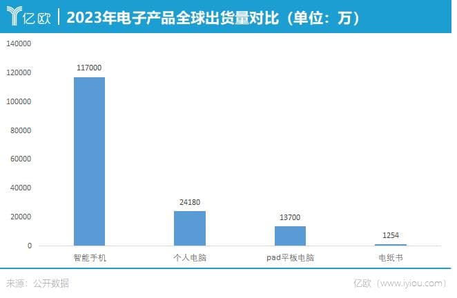 根据洛图科技统计数据,2023年全球电纸书出货量为1254万台,其中国内为123万台。而在同年,综合IDC等调研数据,全球智能手机出货量为11.7亿部,个人电脑出货量为2.418亿台,pad平板电脑出货量为1.37亿台。