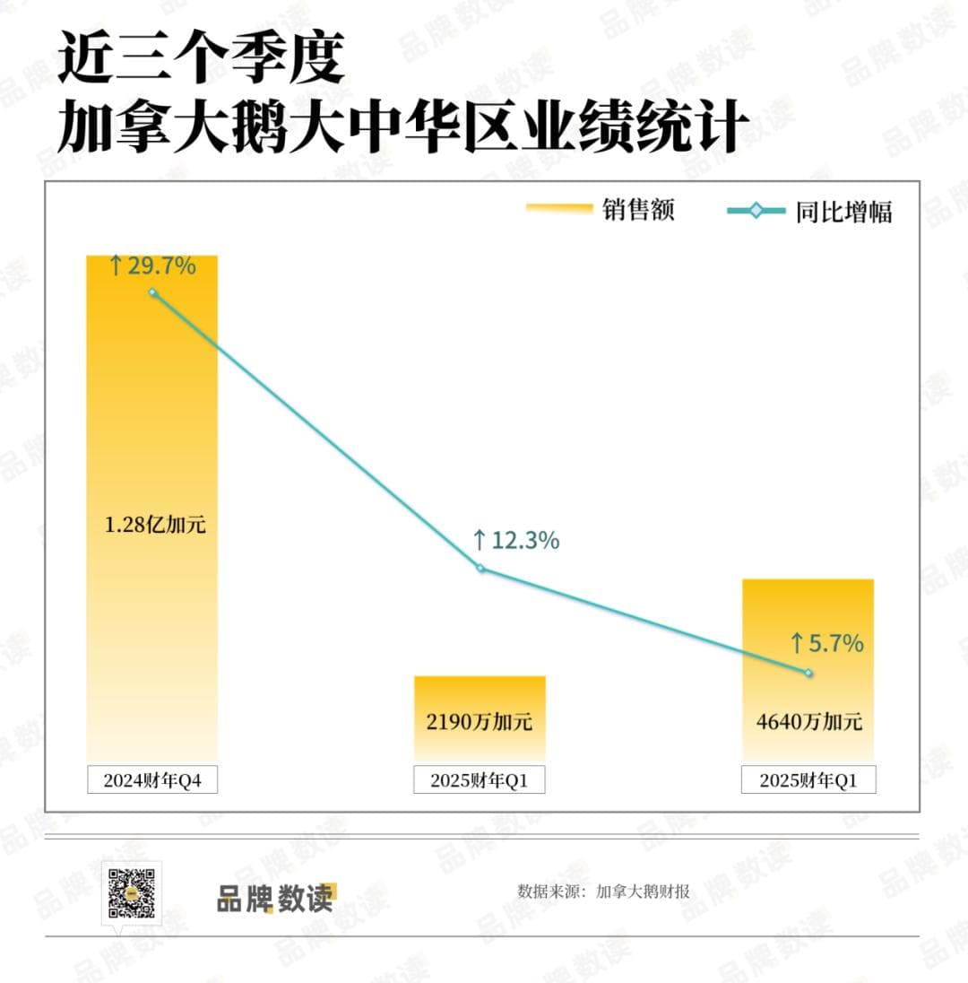 品牌数读查阅加拿大鹅过往几个财季财报发现, 大中华区的销售额同比增幅正在大幅度降低 。如2024财年第四季度,大中华区的销售额同比增幅达到近30%,到了2025财年第一季度,这一数字降至12.3%,最新一个财季,大中华区的销售额同比增幅进一步降到了个位数。
