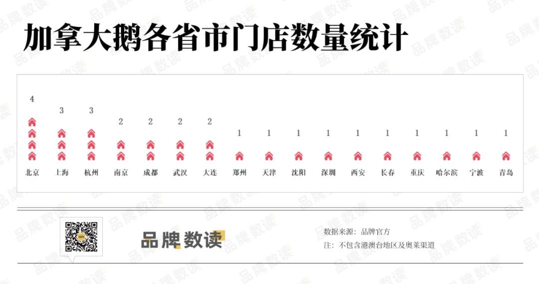 可见, 今年加拿大鹅在线下渠道打起了“安全牌”,而谨慎的扩张策略也导致了加拿大鹅城市布局进展缓慢, 据品牌数读统计,目前加拿大鹅仅在中国17城(不包含港澳台地区)设有独立门店,且除了北京、上海、杭州之外,另外14城的门店数量均只有1家或2家。
