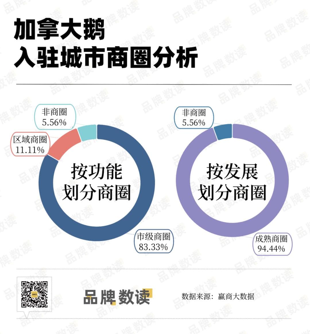 用具体的数据来佐证上述观点,赢商大数据统计显示,以27城5万方以上代表性购物中心为统计范围,加拿大鹅将八成以上的门店开设在市级商圈、近95%的门店落位成熟商圈。