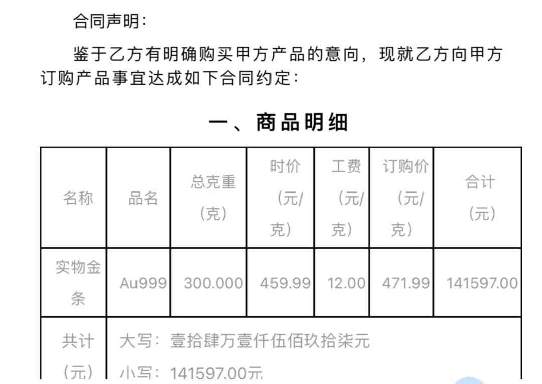 陈女士向记者提供的一份合同显示,其与福州中孚可观贸易有限公司(为可观珠宝的子公司,以下简称“可观贸易”)签署的是《金条订购合同》。陈女士向可观贸易订购300克的Au999实物金条,时价为459.99元/克,工费为12元/克,合计金额约14.16万元。
