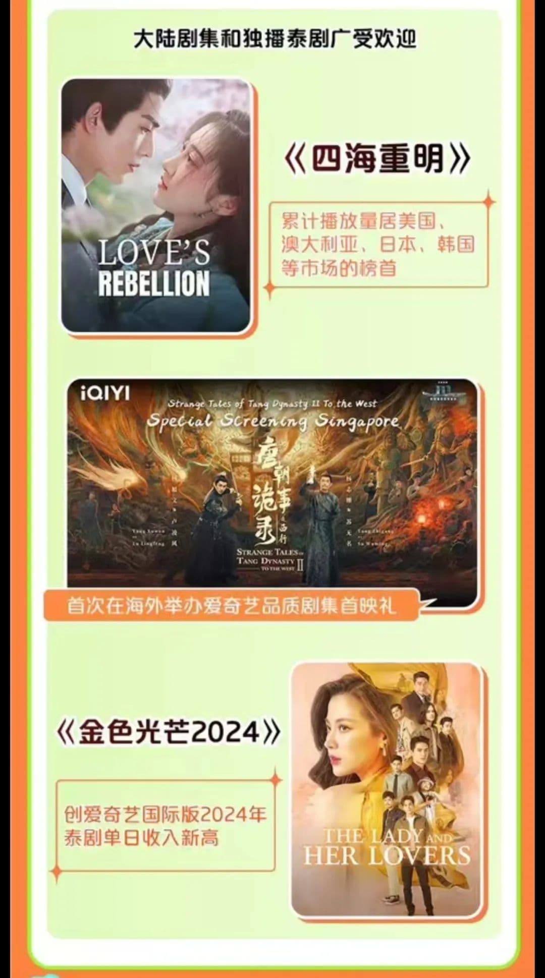 目前爱优腾芒的国际版内容主要由三部分构成,第一部分是国内站的自制或版权内容;其次是和国外本土制作团队合拍的影视剧;第三部分是购买版权的内容。虽然涉及电视剧、综艺、动漫、纪录片等多个内容品类,但电视剧都是国际版的主营内容。