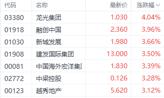 房地产股中,龙光集团(03380.HK)、融创中国(01918.HK)、新城发展(01030.HK)分别上涨4.04%、3.96%、3.66%。